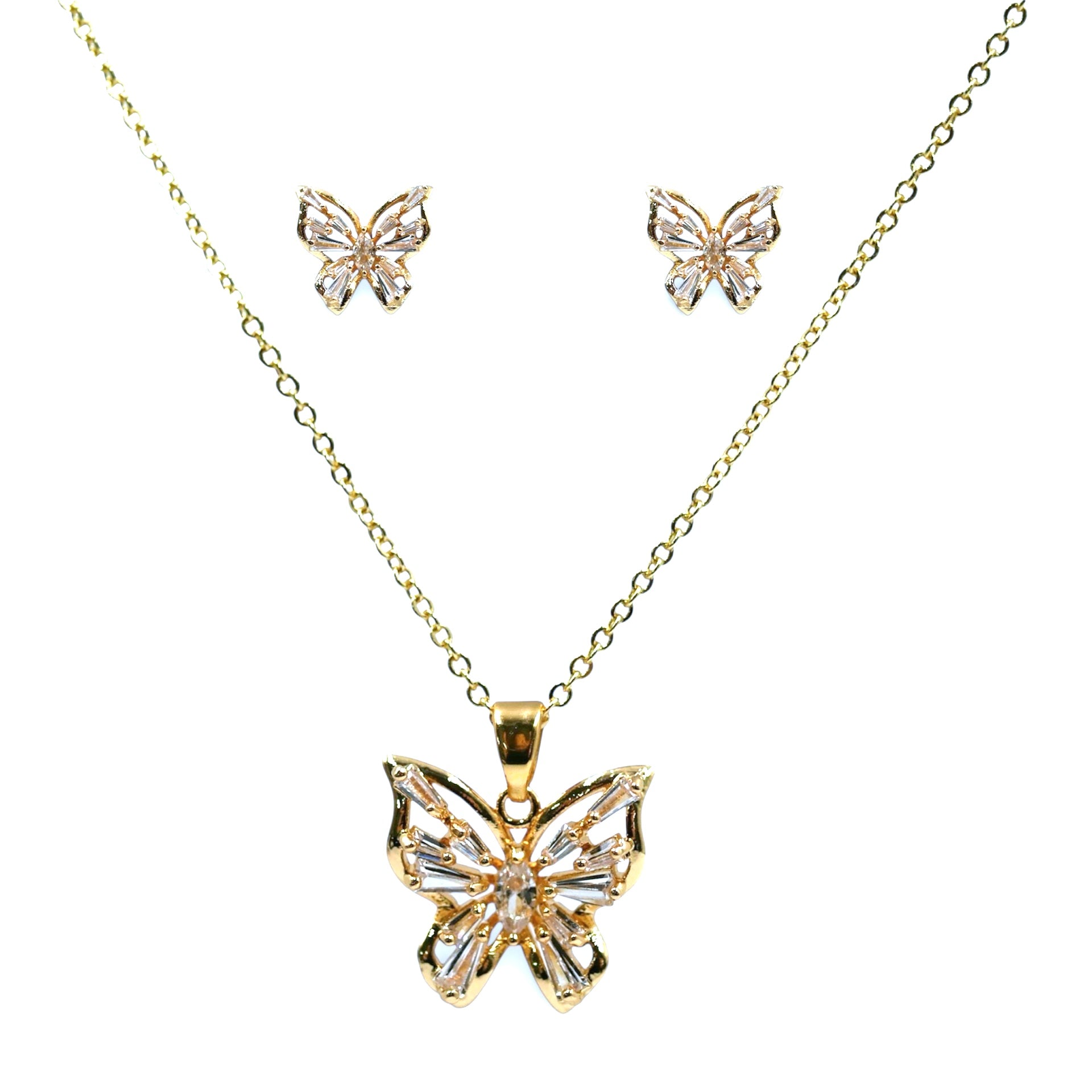 Add a touch of timeless elegance to your look with our Butterfly Sparkle Jewellery Set, a stunning 2-piece combo designed to elevate any outfit. This premium set includes a beautifully crafted necklace and a matching pair of earrings, featuring delicate butterfly motifs adorned with brilliant Cubic Zirconia stones for a luxurious shine.